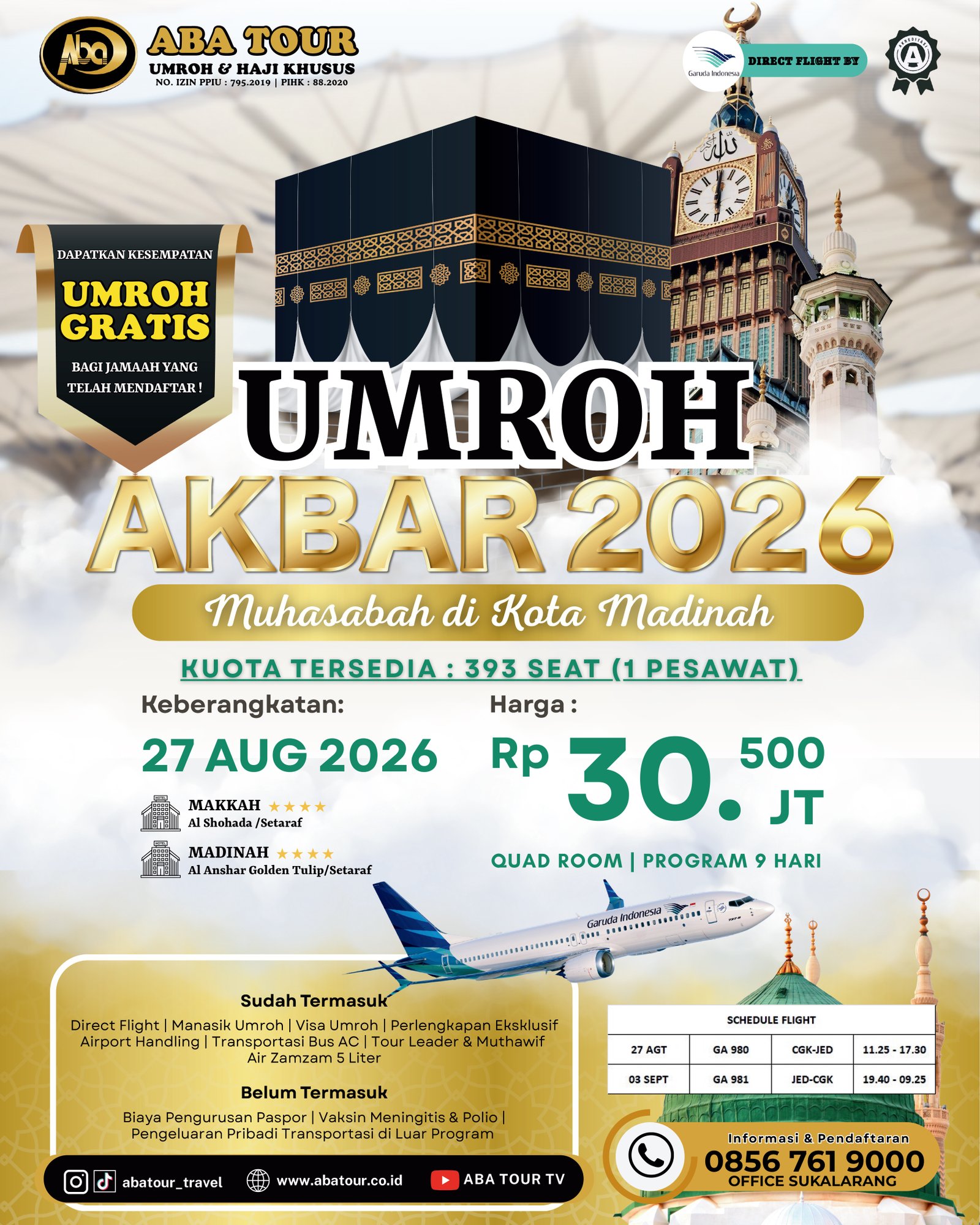 ABA TOUR kembali menghadirkan program spesial berskala besar UMROH AKBAR 2026, sebuah perjalanan ibadah istimewa dengan konsep kebersamaan dalam satu pesawat penuh (393 jamaah) yang menghadirkan suasana lebih khidmat, terorganisir, dan penuh semangat ukhuwah.